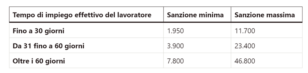 Il datore di lavoro (escluso quello domestico) che utilizza personale in modo non regolare, ovvero senza che vi sia stata la relativa comunicazione di assunzione, è sanzionabile secondo le fasce riportate nella tabella seguente: